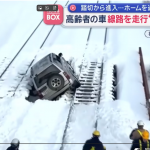 雪が積もるなか、線路と線路の間に挟まっている1台の乗用車。